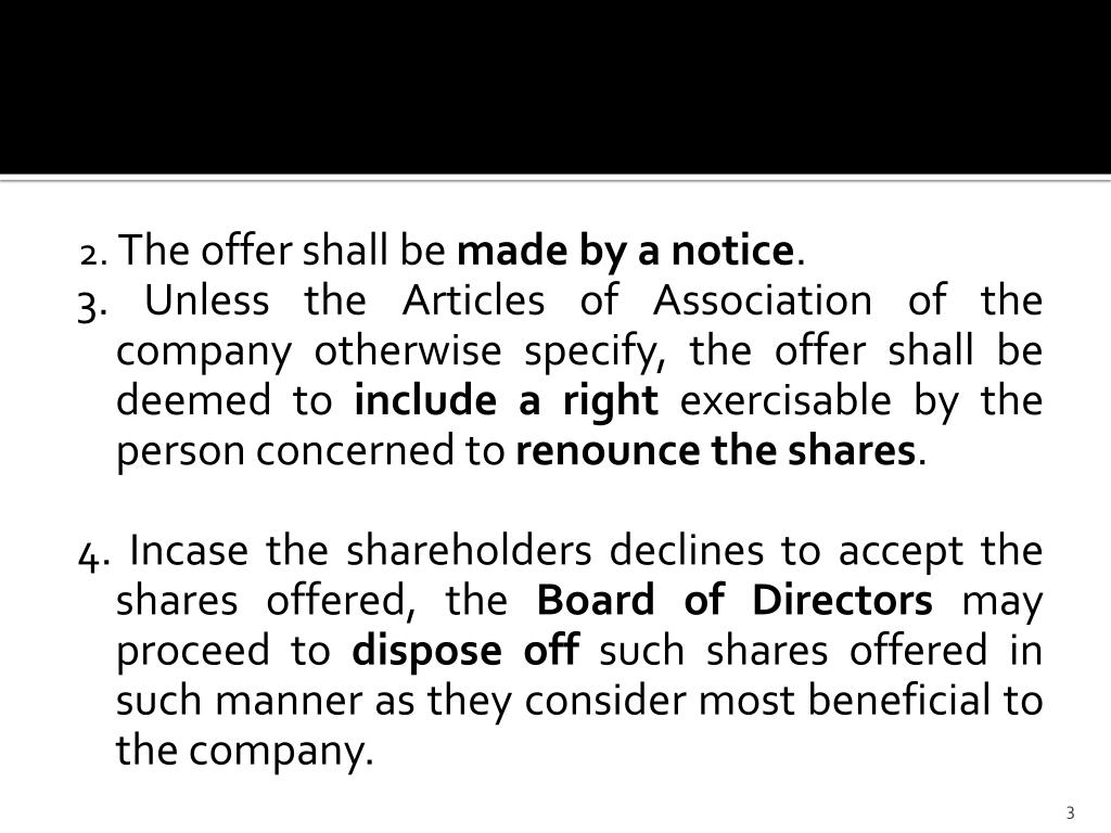 2. The offer shall be made by a notice. 3. Unless the Articles of Association of the company otherwise specify, the offer shall be deemed to include a right exercisable by the person concerned to renounce the shares. 4. Incase the shareholders declines to accept the shares offered, the Board of Directors may proceed to dispose off such shares offered in such manner as they consider most beneficial to the company.