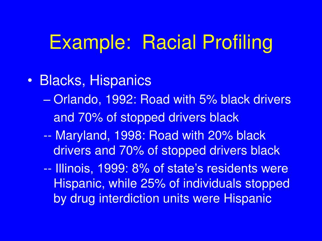 Example: Racial Profiling • Blacks, Hispanics • Orlando, 1992: Road with 5% black drivers and 70% of stopped drivers black -- Maryland, 1998: Road with 20% black drivers and 70% of stopped drivers black -- Illinois, 1999: 8% of state’s residents were Hispanic, while 25% of individuals stopped by drug interdiction units were Hispanic