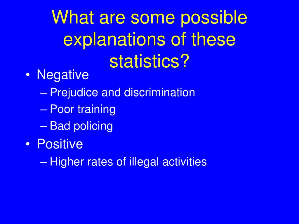 What are some possible explanations of these statistics? • Negative • Prejudice and discrimination • Poor training • Bad policing • Positive • Higher rates of illegal activities