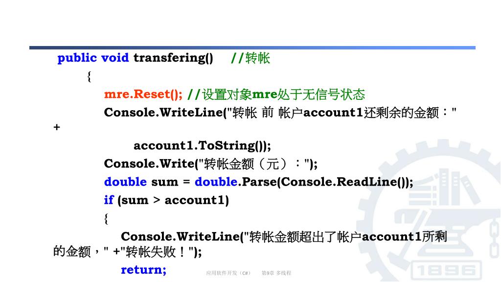 public void transfering() //转帐 { mre.Reset(); //设置对象mre处于无信号状态 Console.WriteLine("转帐 前 帐户account1还剩余的金额:" + account1.ToString()); Console.Write("转帐金额(元):"); double sum = double.Parse(Console.ReadLine()); if (sum > account1) { Console.WriteLine("转帐金额超出了帐户account1所剩的金额," +"转帐失败!"); return; }