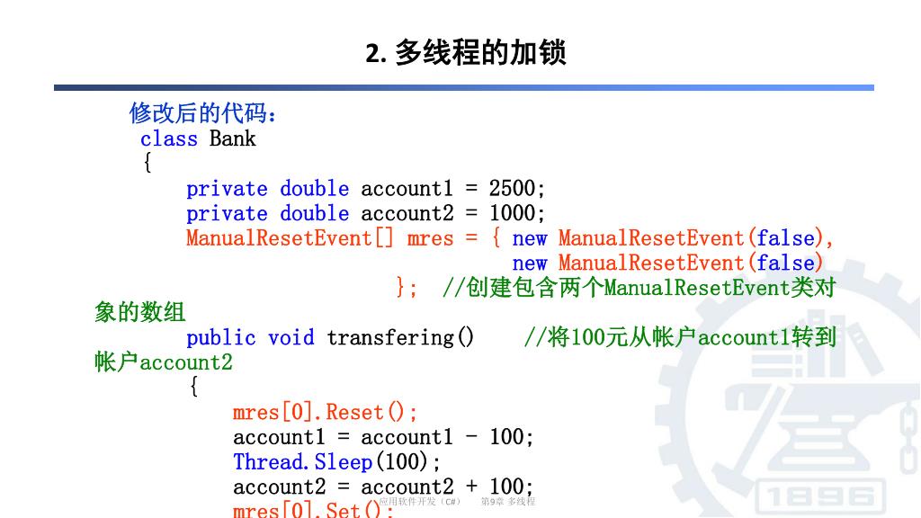 1. 单线程的加锁 • 对程序BankTransfering出现问题的解决办法: • 通过创建ManualResetEvent类的对象mre,并适当地添加mre.Reset()和mre.Set() 添加同步控制 • 代码修改如下(红色部分): • class Bank • { • private double account1 = 2500; • private double account2 = 1000; • //创建ManualResetEvent类的对象mre • public ManualResetEvent mre = new ManualResetEvent(false);