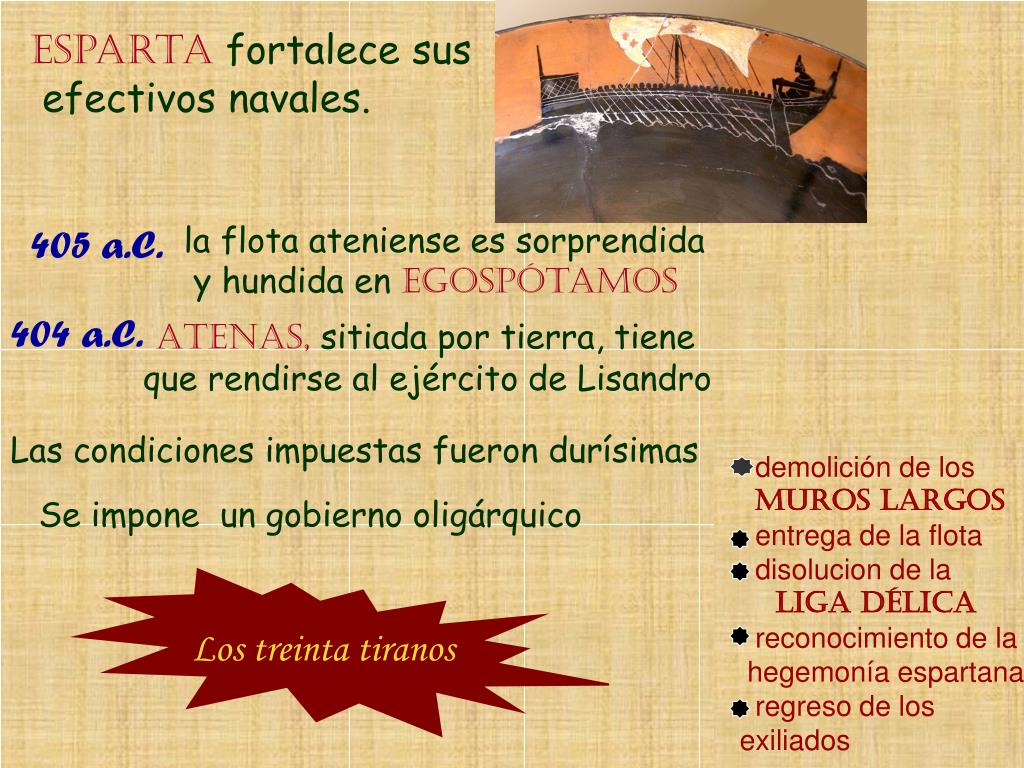 Esparta fortalece sus efectivos navales. 405 a.C. la flota ateniense es sorprendida y hundida en Egospótamos 404 a.C. Atenas, sitiada por tierra, tiene que rendirse al ejército de Lisandro Las condiciones impuestas fueron durísimas demolición de los Muros Largos entrega de la flota disolucion de la LIGA DÉLICA reconocimiento de la hegemonía espartana regreso de los exiliados Se impone un gobierno oligárquico Los treinta tiranos