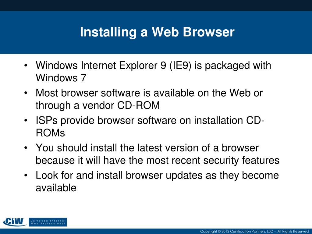 Installing a Web Browser • Windows Internet Explorer 9 (IE9) is packaged with Windows 7 • Most browser software is available on the Web or through a vendor CD-ROM • ISPs provide browser software on installation CD-ROMs • You should install the latest version of a browser because it will have the most recent security features • Look for and install browser updates as they become available