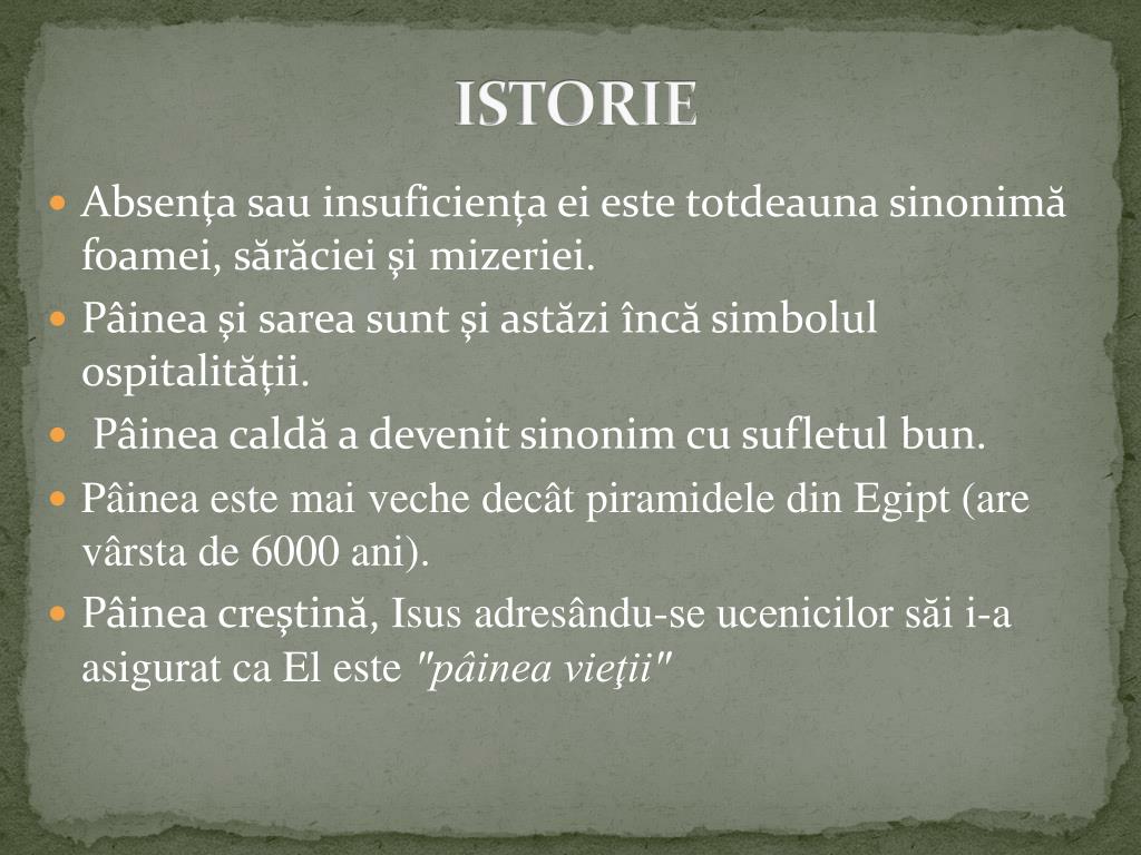 ISTORIE • Absenţa sau insuficienţa ei este totdeauna sinonimă foamei, sărăciei şi mizeriei. • Pâinea şi sarea sunt şi astăzi încă simbolul ospitalităţii. • Pâinea caldă a devenit sinonim cu sufletul bun. • Pâinea este mai veche decât piramidele din Egipt (are vârsta de 6000 ani). • Pâinea creştină, Isus adresându-se ucenicilor săi i-a asigurat ca El este "pâinea vieţii"