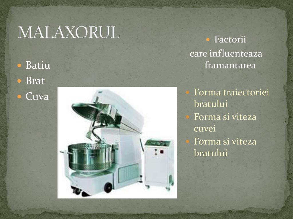 Factorii care influenteaza framantarea Forma traiectoriei bratului Forma si viteza cuvei Forma si viteza bratului MALAXORUL • Batiu • Brat • Cuva