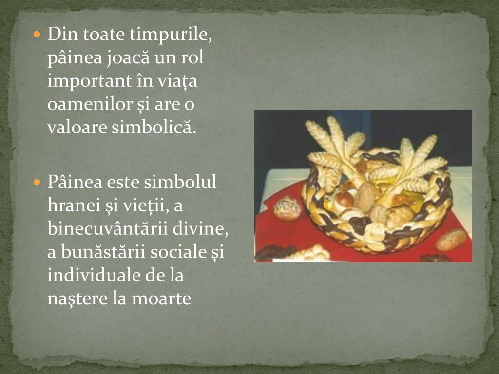 Din toate timpurile, pâinea joacă un rol important în viaţa oamenilor şi are o valoare simbolică. • Pâinea este simbolul hranei şi vieţii, a binecuvântării divine, a bunăstării sociale şi individuale de la naştere la moarte