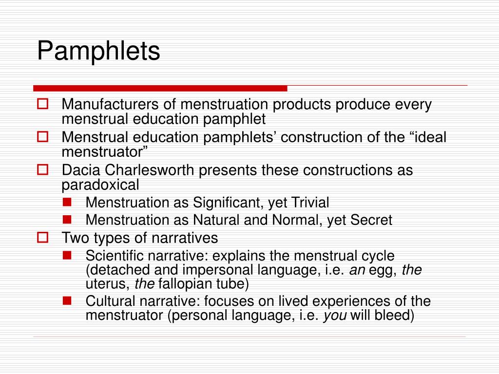 Pamphlets • Manufacturers of menstruation products produce every menstrual education pamphlet • Menstrual education pamphlets’ construction of the “ideal menstruator” • Dacia Charlesworth presents these constructions as paradoxical • Menstruation as Significant, yet Trivial • Menstruation as Natural and Normal, yet Secret • Two types of narratives • Scientific narrative: explains the menstrual cycle (detached and impersonal language, i.e. an egg, the uterus, the fallopian tube) • Cultural narrative: focuses on lived experiences of the menstruator (personal language, i.e. you will bleed)