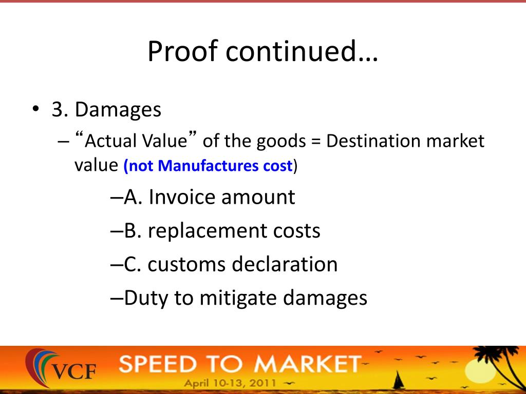 Proof continued… • 3. Damages • “Actual Value” of the goods = Destination market value (not Manufactures cost) • A. Invoice amount • B. replacement costs • C. customs declaration • Duty to mitigate damages