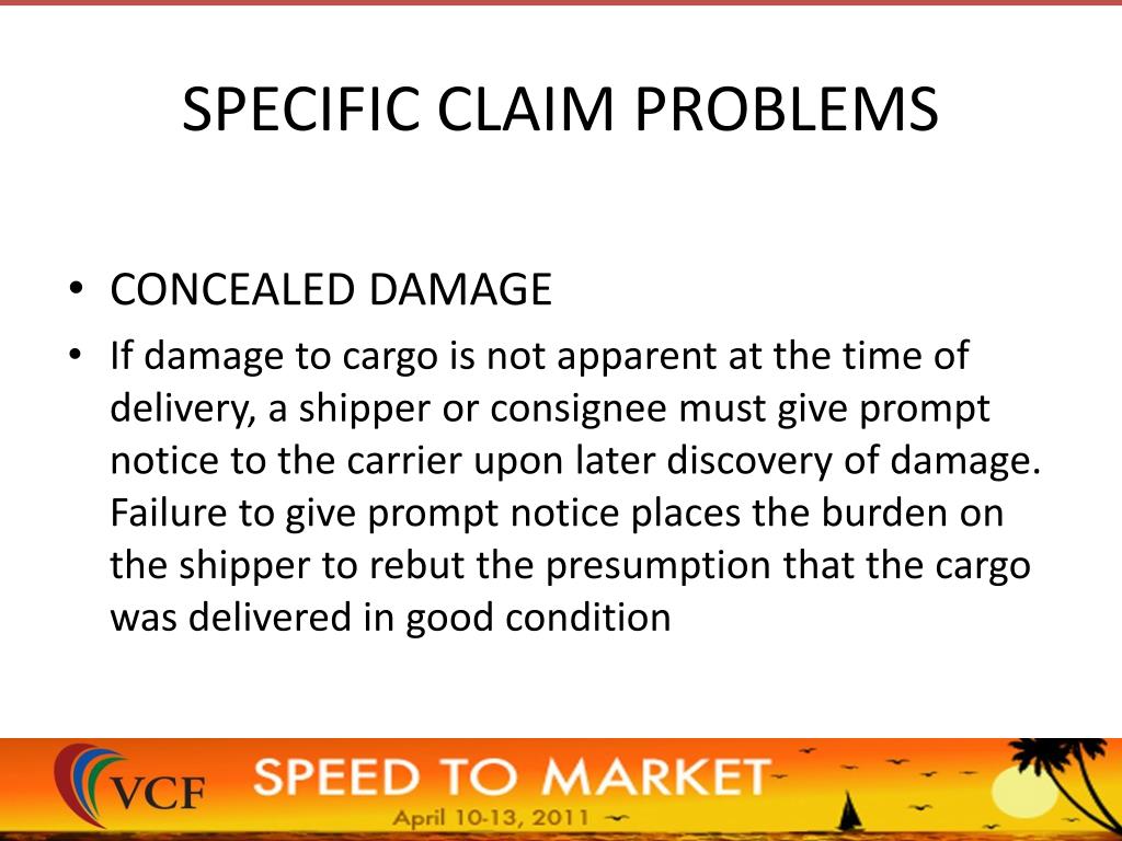 SPECIFIC CLAIM PROBLEMS • CONCEALED DAMAGE • If damage to cargo is not apparent at the time of delivery, a shipper or consignee must give prompt notice to the carrier upon later discovery of damage. Failure to give prompt notice places the burden on the shipper to rebut the presumption that the cargo was delivered in good condition