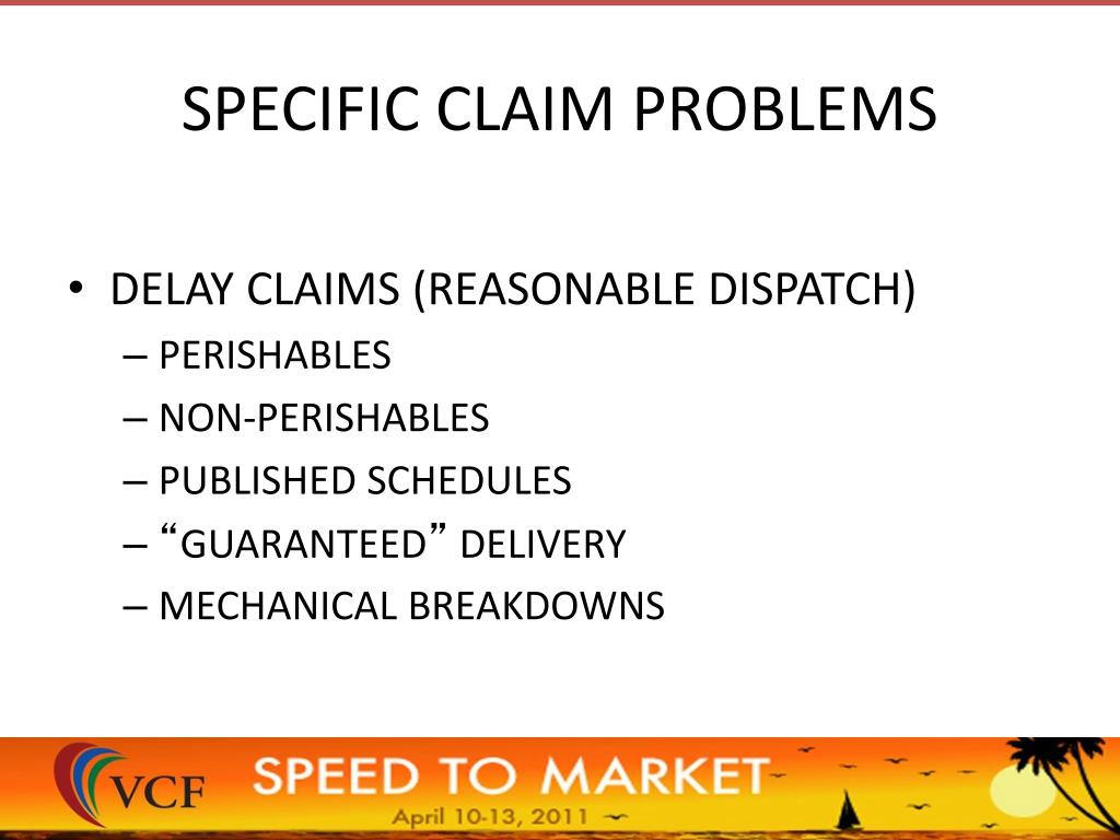 SPECIFIC CLAIM PROBLEMS • DELAY CLAIMS (REASONABLE DISPATCH) • PERISHABLES • NON-PERISHABLES • PUBLISHED SCHEDULES • “GUARANTEED” DELIVERY • MECHANICAL BREAKDOWNS