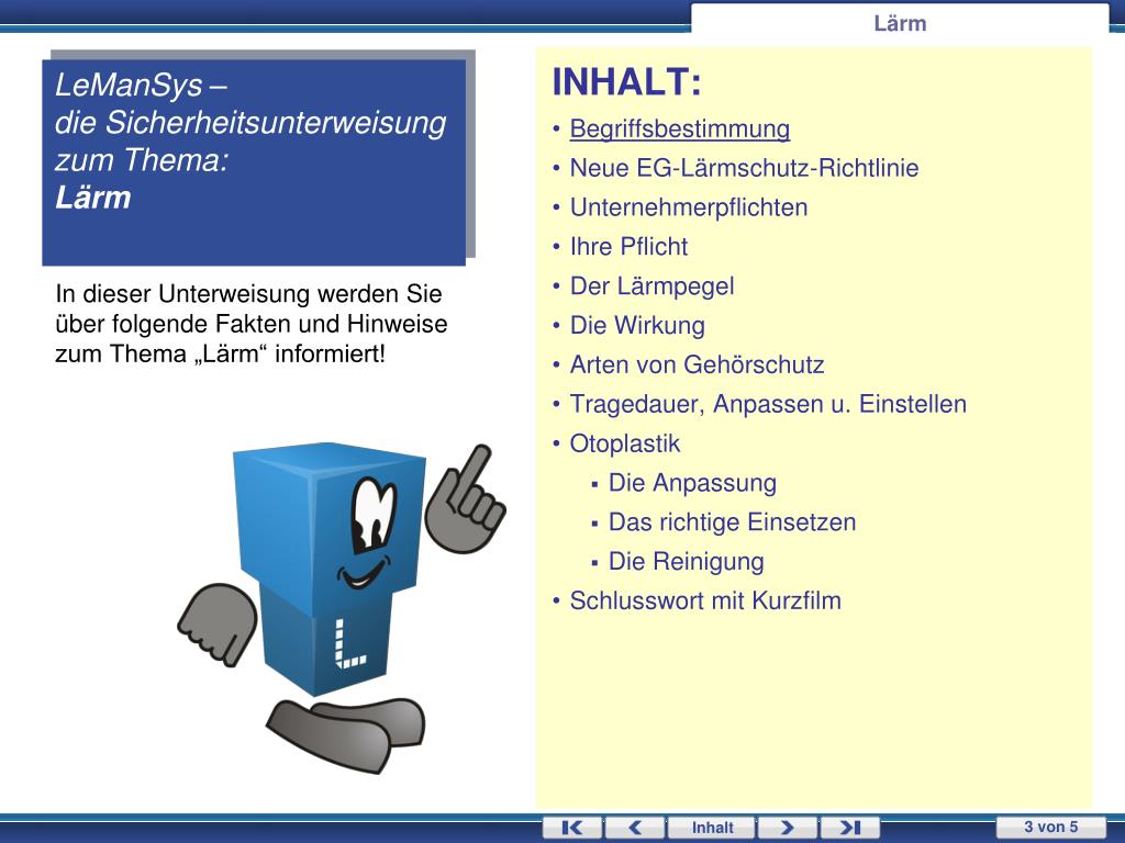 Vorwort Vorwort zur LeManSys-Sicherheitsunterweisung In der folgenden Präsentation erhalten Sie die notwendigen Informationen und Hinweise zum Thema „Lärm“. Arbeiten Sie diese Unterweisung* gewissenhaft durch, denn zum Abschluss erwartet Sie ein Test (Multiple Choice). * Hinweise: Ihr Arbeitgeber ist zu regelmäßigen Unterweisungen im Arbeitsschutz gesetzlich verpflichtet. (§ 12 ArbSchutzG) Die Bearbeitung mit bestandenem Test weist nach, dass Sie die Inhalte gelesen und verstanden haben. Dokumentiert wird, dass Sie die Unterweisung erfolgreich bearbeitet haben. Eine Leistungsbewertung findet nicht statt! Übrigens, mein Name steht für LernManager In diesem Sinne auf gute Zusammenarbeit Viel Spaß und guten Erfolg wünscht Ihnen Ihr LeMan