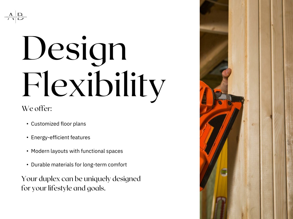Ambassador Builders Approach Our process includes: • Personalized design consultation • Transparent planning and budgeting • Skilled craftsmanship from foundation to finish • On-time and on-budget project delivery We make the duplex building experience smooth and collaborative.