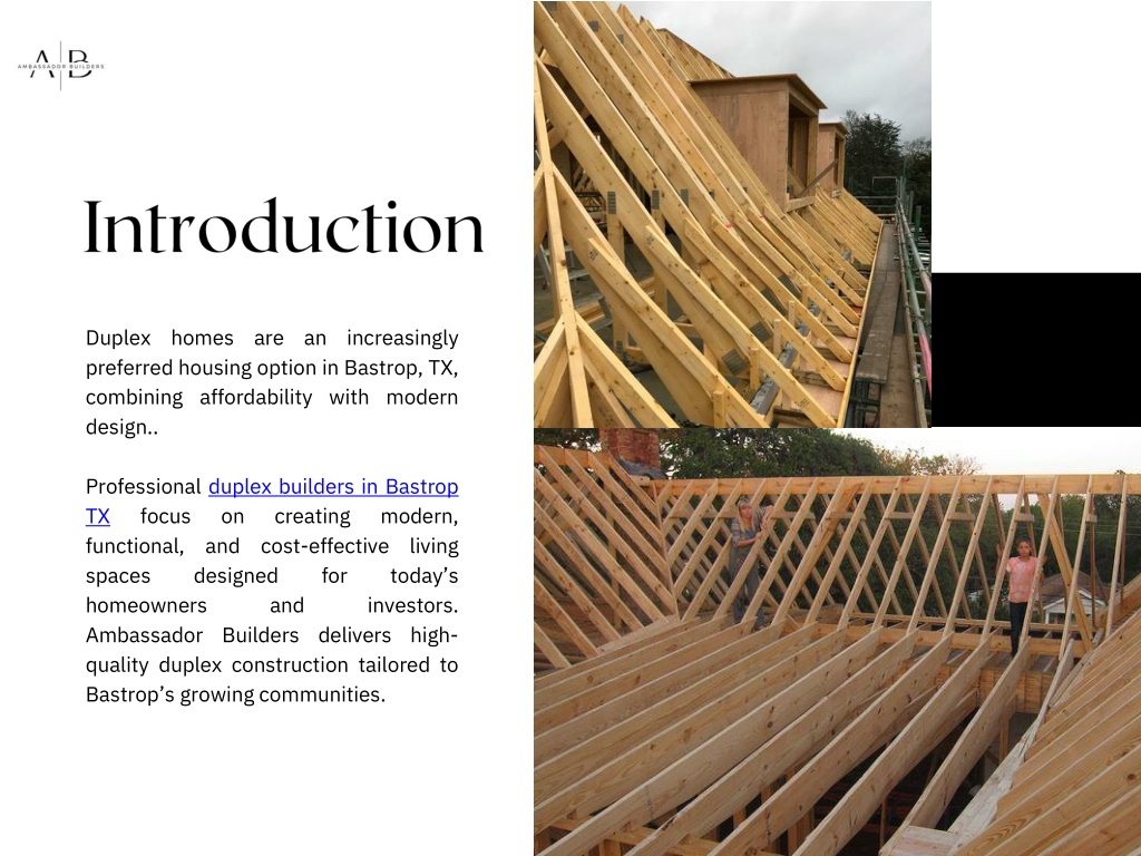 Introduction Duplex homes are an increasingly preferred housing option in Bastrop, TX, combining affordability with modern design.. Professional duplex builders in Bastrop TX focus on creating modern, functional, and cost-effective living spaces designed for today’s homeowners and investors. Ambassador Builders delivers high-quality duplex construction tailored to Bastrop’s growing communities.