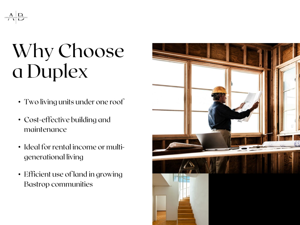 Why Choose a Duplex • Two living units under one roof • Cost-effective building and maintenance • Ideal for rental income or multi-generational living • Efficient use of land in growing Bastrop communities