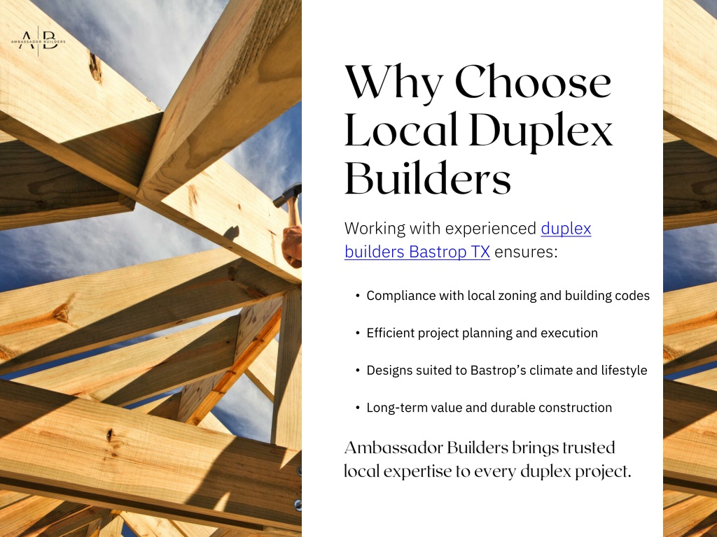 Why Choose Local Duplex Builders Working with experienced duplex builders Bastrop TX ensures: • Compliance with local zoning and building codes • Efficient project planning and execution • Designs suited to Bastrop’s climate and lifestyle • Long-term value and durable construction Ambassador Builders brings trusted local expertise to every duplex project.