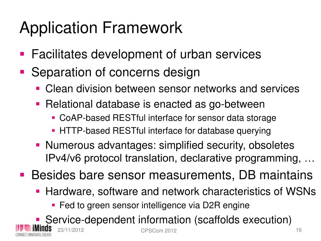 Application Framework • Facilitates development of urban services • Separation of concerns design • Clean division between sensor networks and services • Relational database is enacted as go-between • CoAP-based RESTful interface for sensor data storage • HTTP-based RESTful interface for database querying • Numerous advantages: simplified security, obsoletes IPv4/v6 protocol translation, declarative programming, … • Besides bare sensor measurements, DB maintains • Hardware, software and network characteristics of WSNs • Fed to green sensor intelligence via D2R engine • Service-dependent information (scaffolds execution)