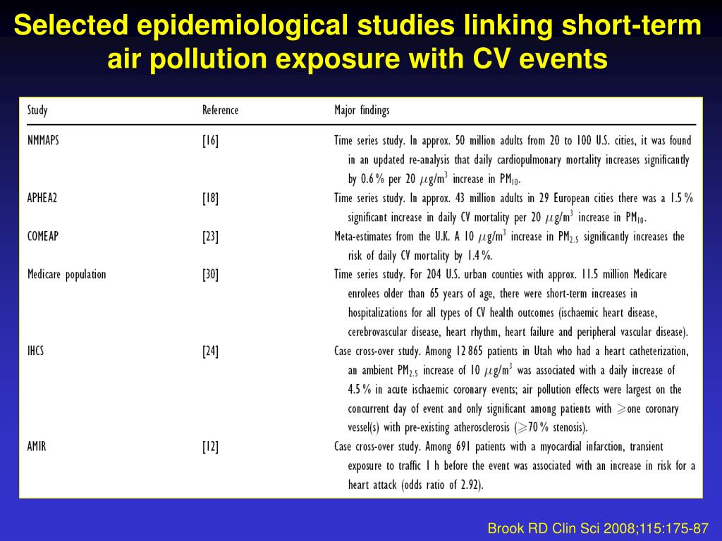 Selected epidemiological studies linking short-term air pollution exposure with CV events Brook RD Clin Sci 2008;115:175-87