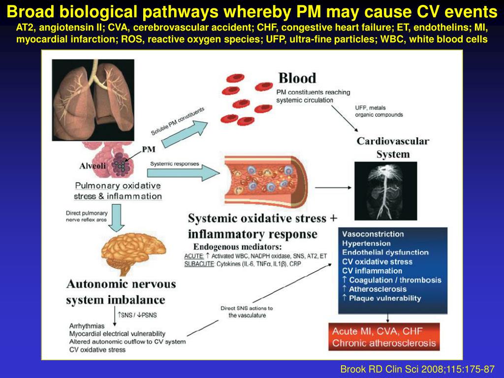 Broad biological pathways whereby PM may cause CV eventsAT2, angiotensin II; CVA, cerebrovascular accident; CHF, congestive heart failure; ET, endothelins; MI, myocardial infarction; ROS, reactive oxygen species; UFP, ultra-fine particles; WBC, white blood cells Brook RD Clin Sci 2008;115:175-87