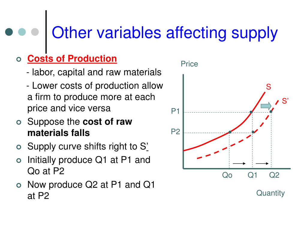 Other variables affecting supply • Costs of Production - labor, capital and raw materials - Lower costs of production allow a firm to produce more at each price and vice versa • Suppose the cost of raw materials falls • Supply curve shifts right to S’ • Initially produce Q1 at P1 and Qo at P2 • Now produce Q2 at P1 and Q1 at P2 Price S S’ P1 P2 Qo Q1 Q2 Quantity
