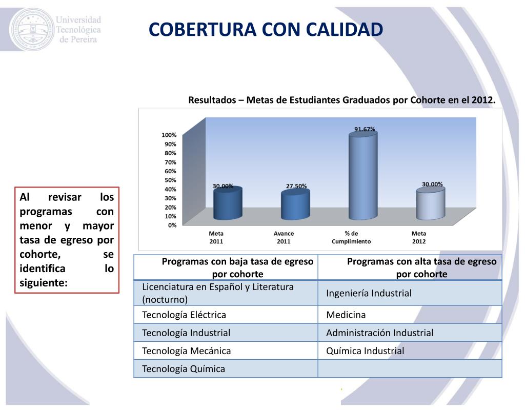COBERTURA CON CALIDAD Resultados – Metas de Estudiantes Graduados por Cohorte en el 2012. Al revisar los programas con menor y mayor tasa de egreso por cohorte, se identifica lo siguiente: