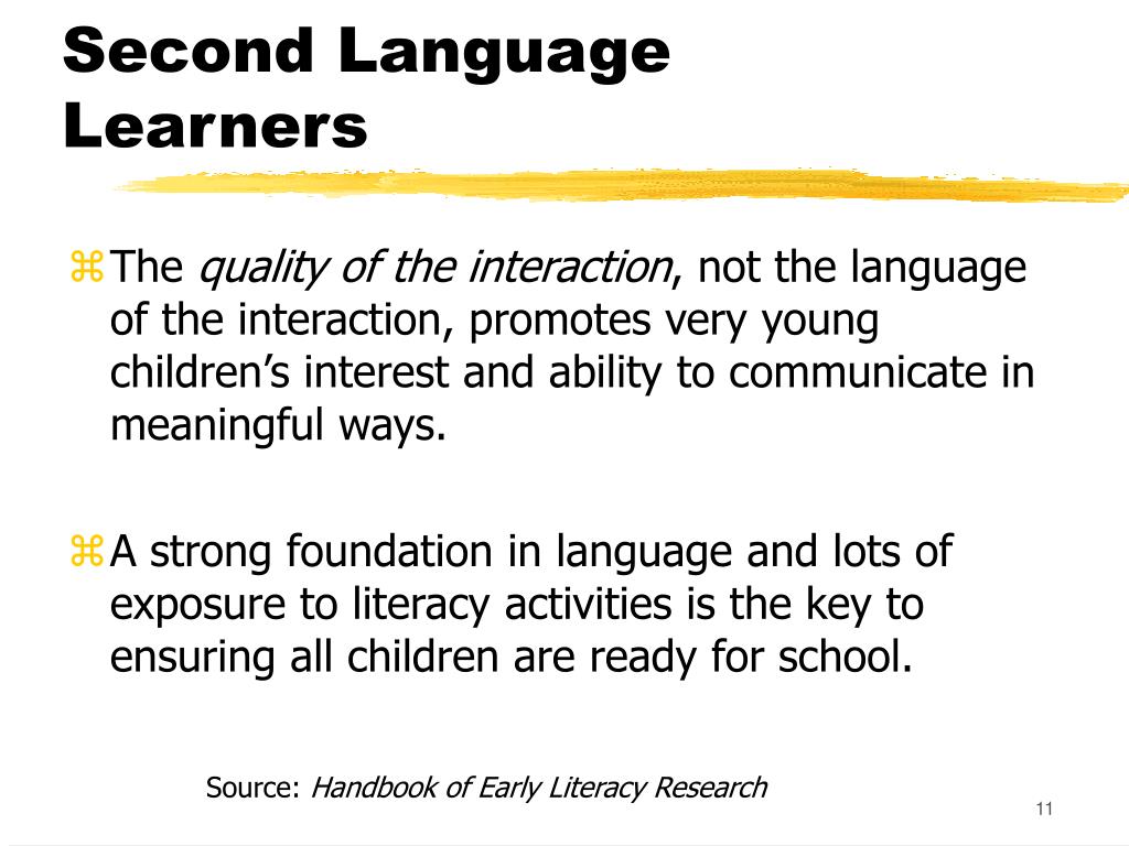 Second Language Learners • The quality of the interaction, not the language of the interaction, promotes very young children’s interest and ability to communicate in meaningful ways. • A strong foundation in language and lots of exposure to literacy activities is the key to ensuring all children are ready for school. Source: Handbook of Early Literacy Research