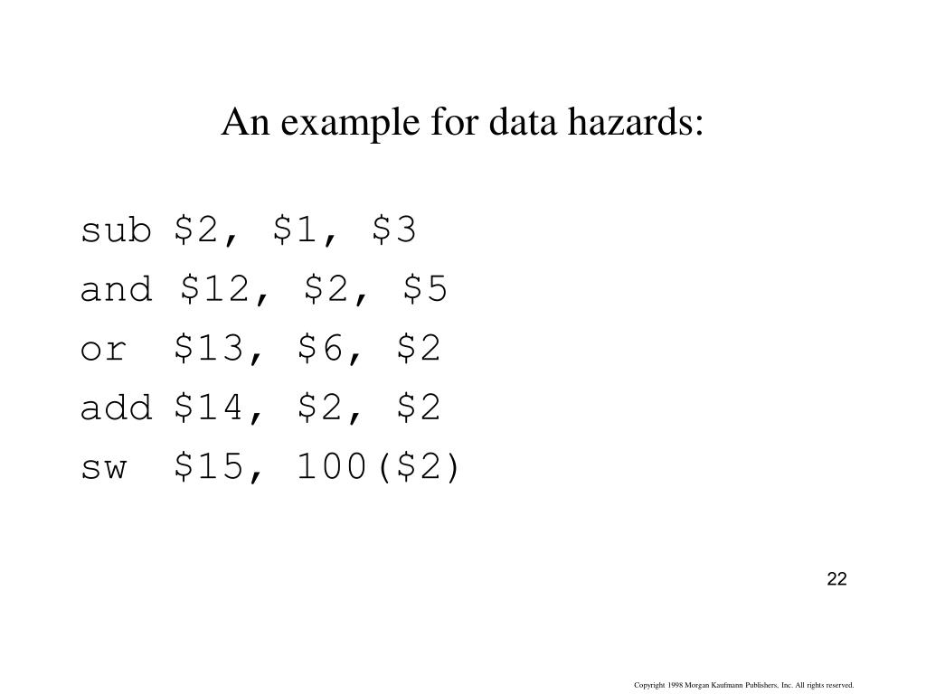 An example for data hazards: sub $2, $1, $3 and $12, $2, $5 or $13, $6, $2 add $14, $2, $2 sw $15, 100($2) An example for data hazards:Register $2 is updated only at the WB phase, i.e., the 5th clock cycle (actually at the end of the 5th clock cycle). However, we try to use it at the 3rd clock cycle when we read $2 at the decode phase of the and instruction