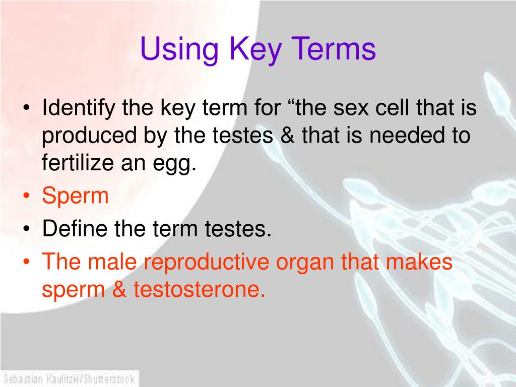Using Key Terms • Identify the key term for “the sex cell that is produced by the testes & that is needed to fertilize an egg. • Sperm • Define the term testes. • The male reproductive organ that makes sperm & testosterone.