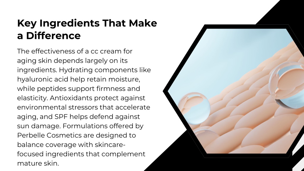 Key Ingredients That Make a Difference The effectiveness of a cc cream for aging skin depends largely on its ingredients. Hydrating components like hyaluronic acid help retain moisture, while peptides support firmness and elasticity. Antioxidants protect against environmental stressors that accelerate aging, and SPF helps defend against sun damage. Formulations offered by Perbelle Cosmetics are designed to balance coverage with skincare- focused ingredients that complement mature skin.