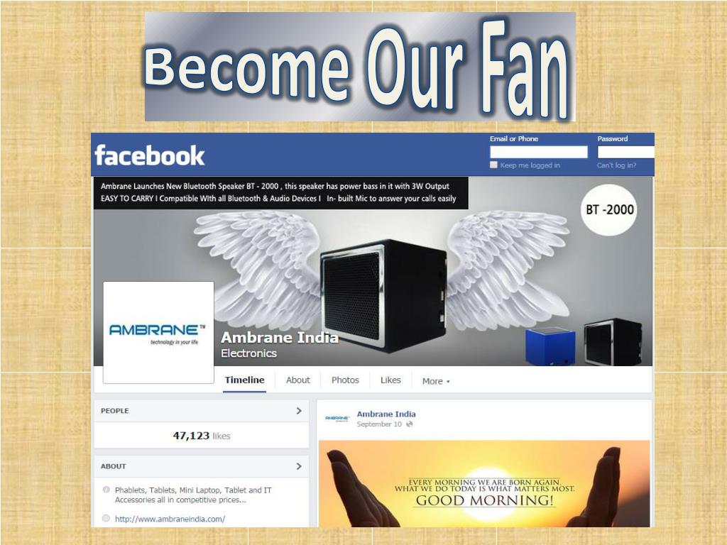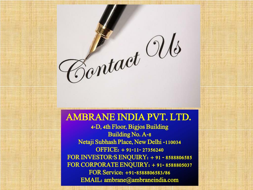 AMBRANE INDIA PVT. LTD. 4-D, 4th Floor, Bigjos BuildingBuilding No. A-8NetajiSubhash Place, New Delhi -110034OFFICE: + 91-11- 27356240FOR INVESTOR'S ENQUIRY: + 91 - 8588806585FOR CORPORATE ENQUIRY: + 91- 8588805037FOR Service: +91-8588806583/86EMAIL: ambrane@ambraneindia.com