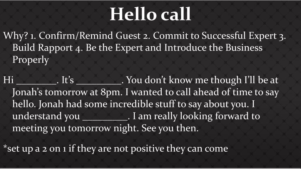 Hello call Why? 1. Confirm/Remind Guest 2. Commit to Successful Expert 3. Build Rapport 4. Be the Expert and Introduce the Business Properly Hi ________. It’s _________. You don’t know me though I’ll be at Jonah’s tomorrow at 8pm. I wanted to call ahead of time to say hello. Jonah had some incredible stuff to say about you. I understand you _________. I am really looking forward to meeting you tomorrow night. See you then. *set up a 2 on 1 if they are not positive they can come