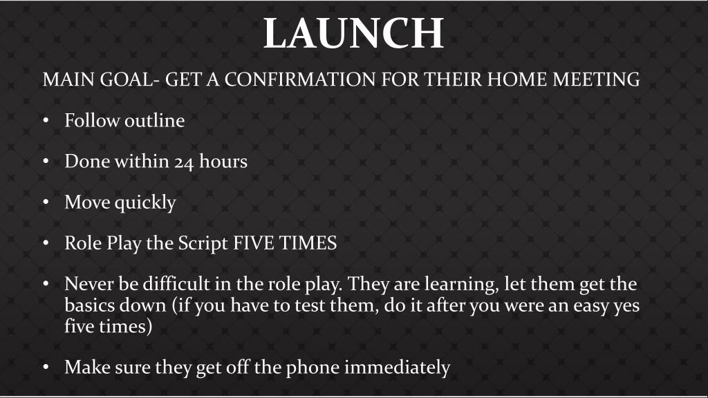 LAUNCH MAIN GOAL- GET A CONFIRMATION FOR THEIR HOME MEETING • Follow outline • Done within 24 hours • Move quickly • Role Play the Script FIVE TIMES • Never be difficult in the role play. They are learning, let them get the basics down (if you have to test them, do it after you were an easy yes five times) • Make sure they get off the phone immediately
