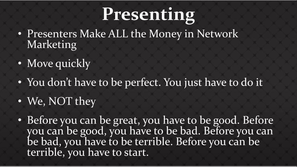 Presenting • Presenters Make ALL the Money in Network Marketing • Move quickly • You don’t have to be perfect. You just have to do it • We, NOT they • Before you can be great, you have to be good. Before you can be good, you have to be bad. Before you can be bad, you have to be terrible. Before you can be terrible, you have to start.