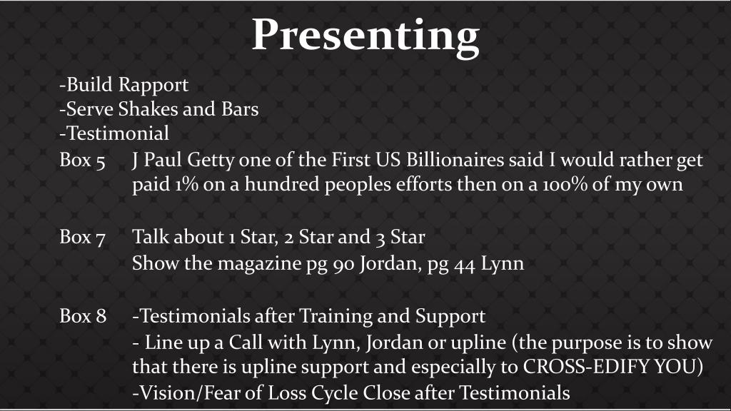 Presenting -Build Rapport -Serve Shakes and Bars -Testimonial Box 5 J Paul Getty one of the First US Billionaires said I would rather get paid 1% on a hundred peoples efforts then on a 100% of my own Box 7 Talk about 1 Star, 2 Star and 3 Star Show the magazine pg 90 Jordan, pg 44 Lynn Box 8 -Testimonials after Training and Support - Line up a Call with Lynn, Jordan or upline (the purpose is to show that there is upline support and especially to CROSS-EDIFY YOU) -Vision/Fear of Loss Cycle Close after Testimonials