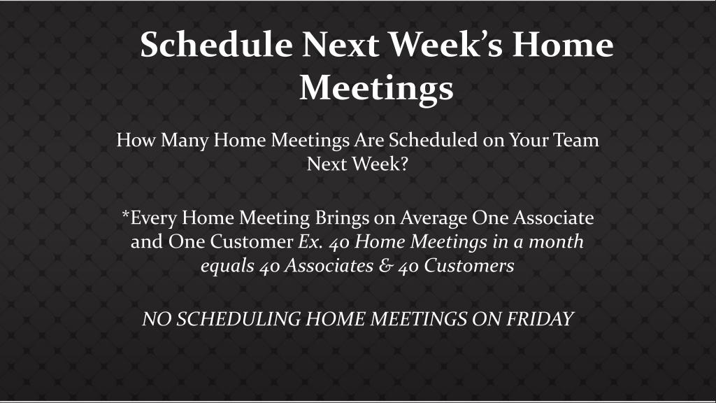 Friday Night L eadership. Schedule Next W eek’s Home Meetings. How Many Home Meetings Are Scheduled on Your Team Next Week? *Every Home Meeting Brings on Average One Associate and One Customer Ex. 40 Home Meetings in a month equals 40 Associates & 40 Customers