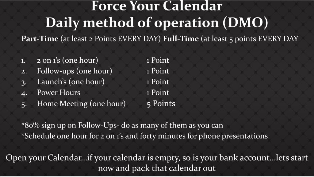 Force Your CalendarDaily method of operation (DMO) Part-Time (at least 2 Points EVERY DAY) Full-Time (at least 5 points EVERY DAY • 2 on 1’s (one hour) 1 Point • Follow-ups (one hour) 1 Point • Launch’s (one hour) 1 Point • Power Hours 1 Point • Home Meeting (one hour) 5 Points *80% sign up on Follow-Ups- do as many of them as you can *Schedule one hour for 2 on 1’s and forty minutes for phone presentations Open your Calendar…if your calendar is empty, so is your bank account…lets start now and pack that calendar out