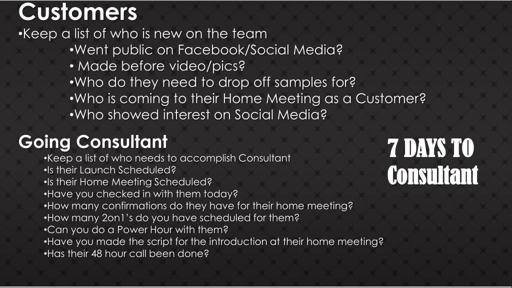 Customers • Keep a list of who is new on the team • Went public on Facebook/Social Media? • Made before video/pics? • Who do they need to drop off samples for? • Who is coming to their Home Meeting as a Customer? • Who showed interest on Social Media? 7 DAYS TO Consultant Going Consultant • Keep a list of who needs to accomplish Consultant • Is their Launch Scheduled? • Is their Home Meeting Scheduled? • Have you checked in with them today? • How many confirmations do they have for their home meeting? • How many 2on1’s do you have scheduled for them? • Can you do a Power Hour with them? • Have you made the script for the introduction at their home meeting? • Has their 48 hour call been done?