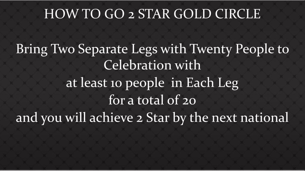 HOW TO GO 2 STAR GOLD CIRCLE Bring Two Separate Legs with Twenty People to Celebration with at least 10 people in Each Leg for a total of 20 and you will achieve 2 Star by the next national