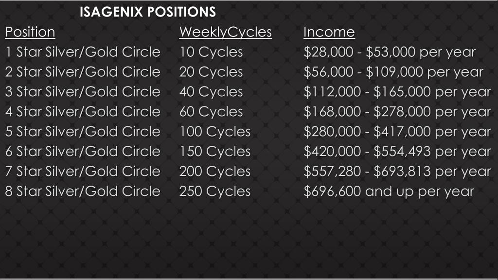 ISAGENIX POSITIONS • PositionWeeklyCyclesIncome • 1 Star Silver/Gold Circle 10 Cycles $28,000 - $53,000 per year • 2 Star Silver/Gold Circle 20 Cycles $56,000 - $109,000 per year • 3 Star Silver/Gold Circle 40 Cycles $112,000 - $165,000 per year • 4 Star Silver/Gold Circle 60 Cycles $168,000 - $278,000 per year • 5 Star Silver/Gold Circle 100 Cycles $280,000 - $417,000 per year • 6 Star Silver/Gold Circle 150 Cycles $420,000 - $554,493 per year • 7 Star Silver/Gold Circle 200 Cycles $557,280 - $693,813 per year • 8 Star Silver/Gold Circle 250 Cycles $696,600 and up per year