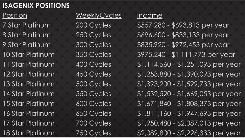 ISAGENIXPOSITIONS • PositionWeeklyCyclesIncome • 7 Star Platinum 200 Cycles $557,280 - $693,813 per year • 8 Star Platinum 250 Cycles $696,600 - $833,133 per year • 9 Star Platinum 300 Cycles $835,920 - $972,453 per year • 10 Star Platinum 350 Cycles $975,240 - $1,111,773 per year • 11 Star Platinum 400 Cycles $1,114,560 - $1,251,093 per year • 12 Star Platinum 450 Cycles $1,253,880 - $1,390,093 per year • 13 Star Platinum 500 Cycles $1,393,200 - $1,529,733 per year • 14 Star Platinum 550 Cycles $1,532,520 - $1,669,053 per year • 15 Star Platinum 600 Cycles $1,671,840 - $1,808,373 per year • 16 Star Platinum 650 Cycles $1,811,160 - $1,947,693 per year • 17 Star Platinum 700 Cycles $1,950,480 - $2,087,013 per year • 18 Star Platinum 750 Cycles $2,089,800 - $2,226,333 per year