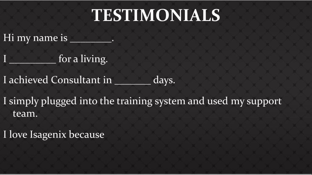 TESTIMONIALS Hi my name is ________. I _________ for a living. I achieved Consultant in _______ days. I simply plugged into the training system and used my support team. I love Isagenix because