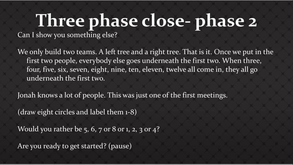 Three phase close- phase 2 Can I show you something else? We only build two teams. A left tree and a right tree. That is it. Once we put in the first two people, everybody else goes underneath the first two. When three, four, five, six, seven, eight, nine, ten, eleven, twelve all come in, they all go underneath the first two. Jonah knows a lot of people. This was just one of the first meetings. (draw eight circles and label them 1-8) Would you rather be 5, 6, 7 or 8 or 1, 2, 3 or 4? Are you ready to get started? (pause)