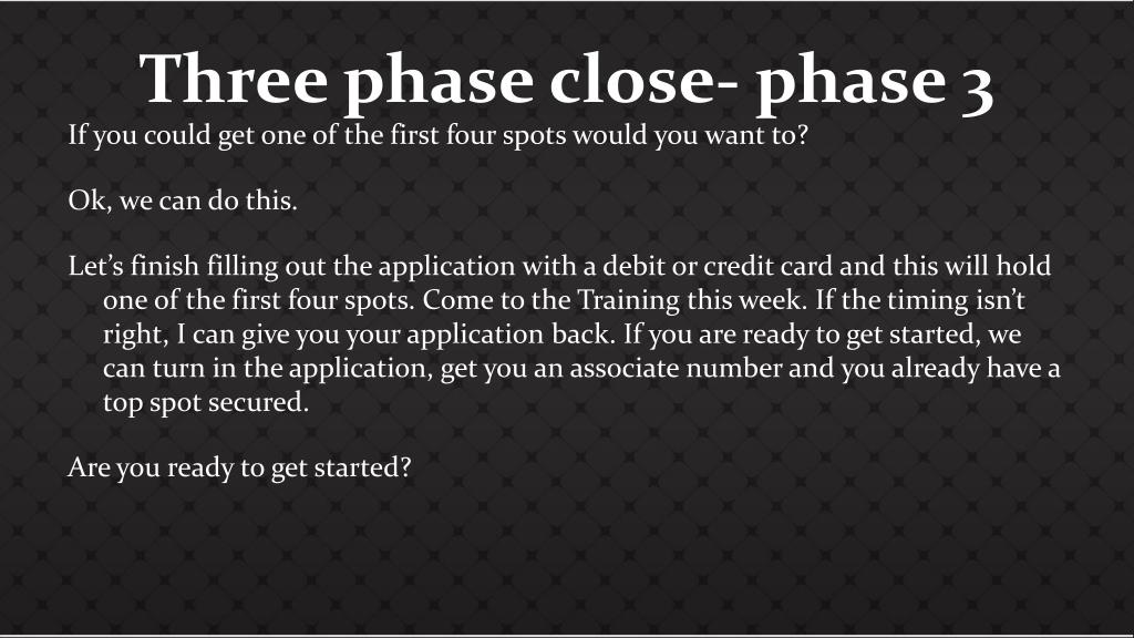 Three phase close- phase 3 If you could get one of the first four spots would you want to? Ok, we can do this. Let’s finish filling out the application with a debit or credit card and this will hold one of the first four spots. Come to the Training this week. If the timing isn’t right, I can give you your application back. If you are ready to get started, we can turn in the application, get you an associate number and you already have a top spot secured. Are you ready to get started?