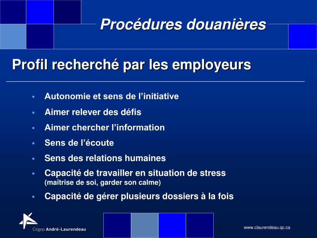 Profil recherché par les employeurs Polyvalence Capacité de développer et de maintenir à jour un ensemble de compétences en procédures douanières et en dédouanement de marchandises