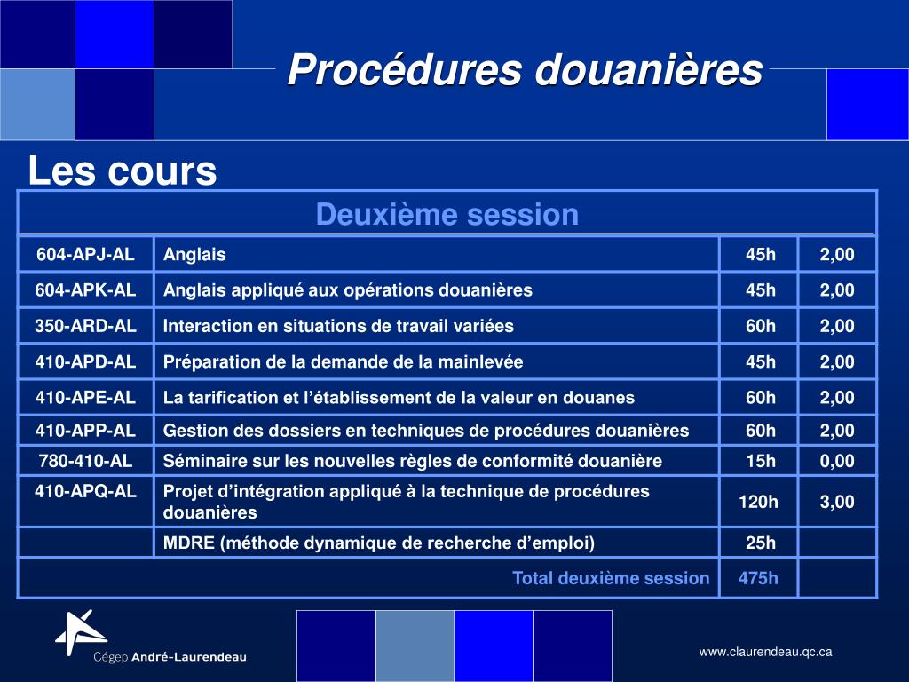 Exigences du programme • Un échec à un cours préalable à un autre compromet la poursuite du programme • Pour obtenir le diplôme d’AEC en Procédures douanières, il faut avoir réussi les 13 cours du programme ainsi que les cours d’appoint