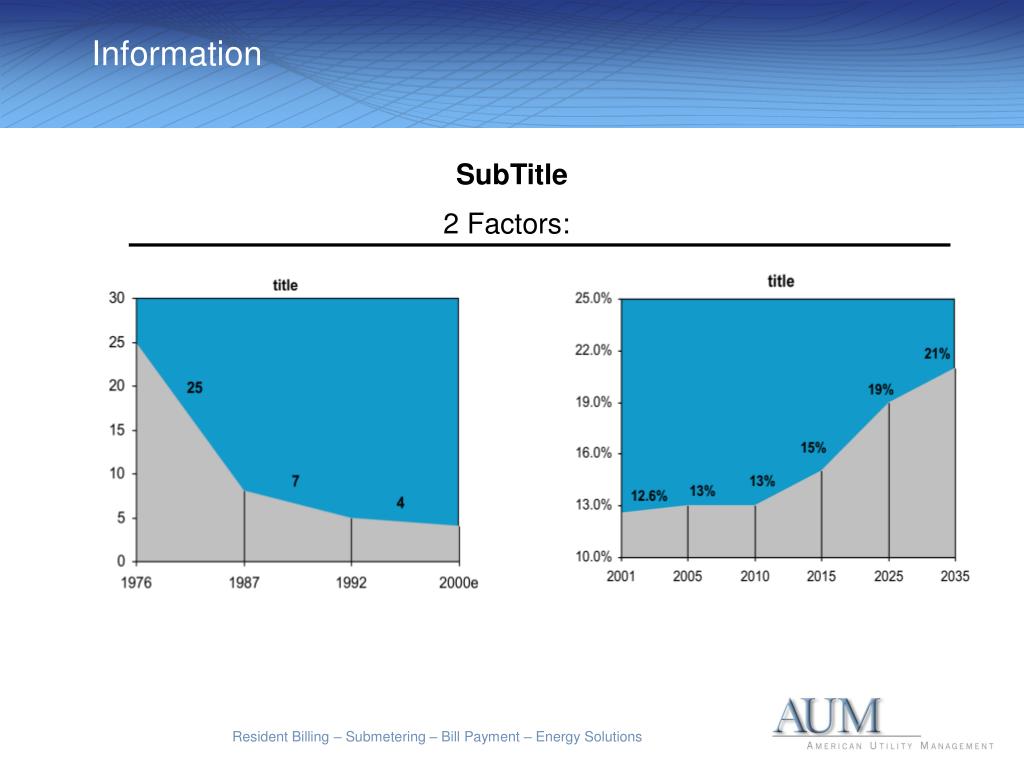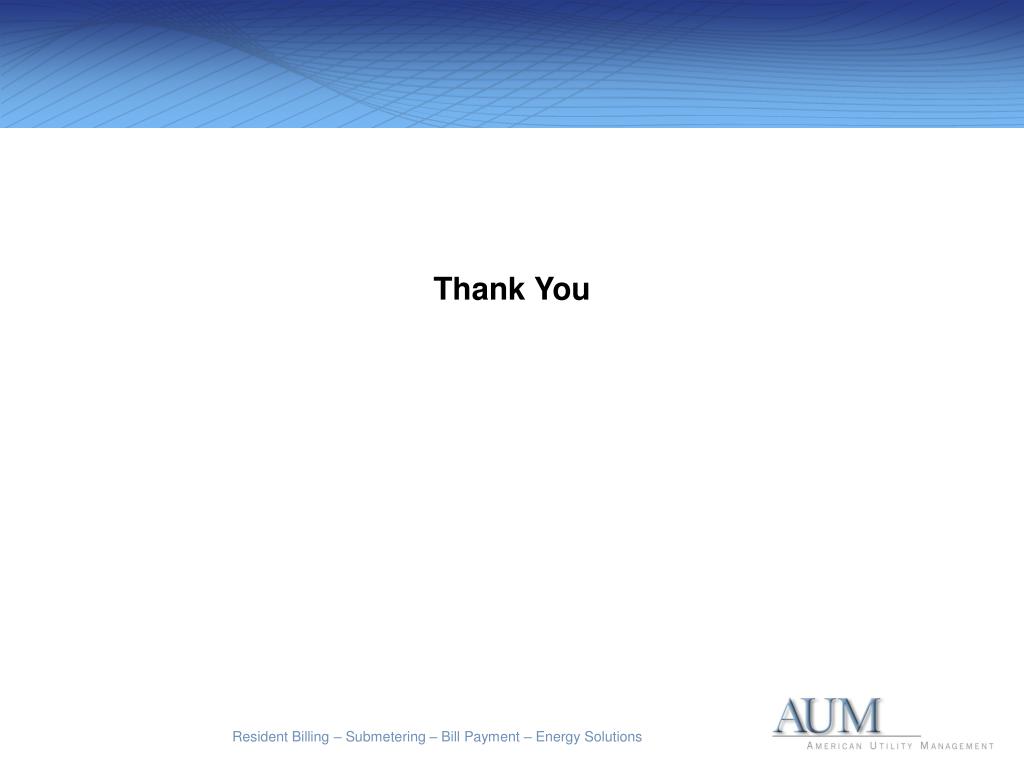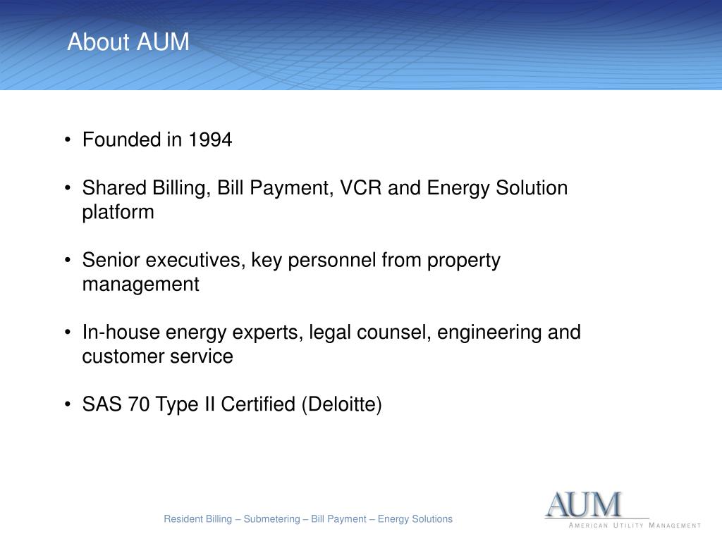 About AUM • Founded in 1994 • Shared Billing, Bill Payment, VCR and Energy Solution platform • Senior executives, key personnel from property management • In-house energy experts, legal counsel, engineering and customer service • SAS 70 Type II Certified (Deloitte)
