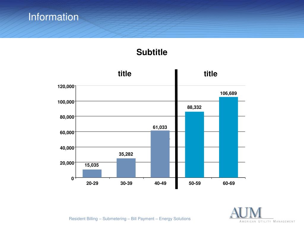 Information Subtitle title title 120,000 106,689 100,000 88,332 80,000 61,033 60,000 40,000 35,282 20,000 15,035 0 20-29 30-39 40-49 50-59 60-69