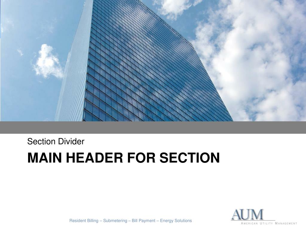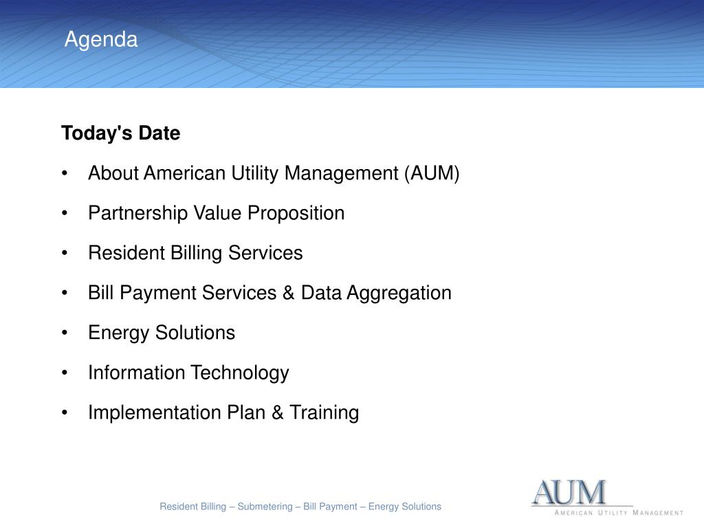 Agenda • Today's Date • About American Utility Management (AUM) • Partnership Value Proposition • Resident Billing Services • Bill Payment Services & Data Aggregation • Energy Solutions • Information Technology • Implementation Plan & Training