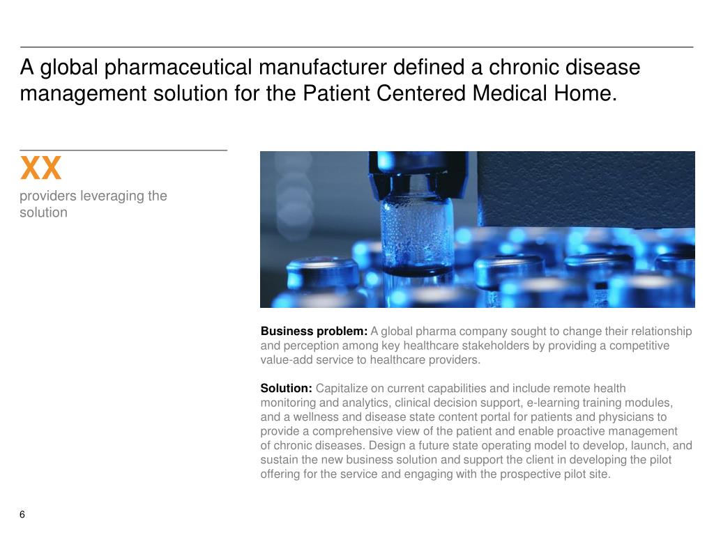 A global pharmaceutical manufacturer defined a chronic disease management solution for the Patient Centered Medical Home. XX providers leveraging the solution Business problem: A global pharma company sought to change their relationship and perception among key healthcare stakeholders by providing a competitive value-add service to healthcare providers. Solution: Capitalize on current capabilities and include remote health monitoring and analytics, clinical decision support, e-learning training modules, and a wellness and disease state content portal for patients and physicians to provide a comprehensive view of the patient and enable proactive management of chronic diseases. Design a future state operating model to develop, launch, and sustain the new business solution and support the client in developing the pilot offering for the service and engaging with the prospective pilot site.