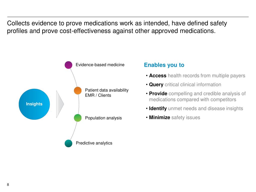 Collects evidence to prove medications work as intended, have defined safety profiles and prove cost-effectiveness against other approved medications. • Access health records from multiple payers • Query critical clinical information • Provide compelling and credible analysis of medications compared with competitors • Identify unmet needs and disease insights • Minimize safety issues Enables you to Evidence-based medicine Patient data availabilityEMR / Clients Insights Population analysis Predictive analytics