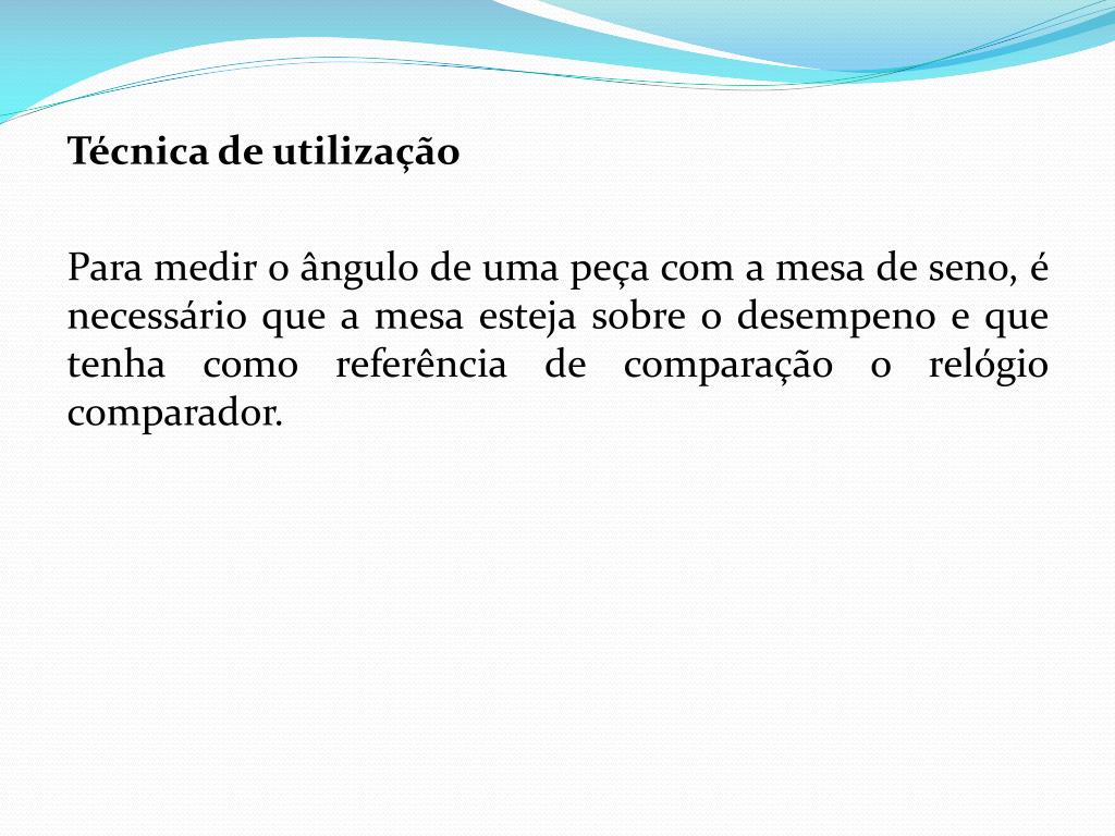 Técnica de utilização Para medir o ângulo de uma peça com a mesa de seno, é necessário que a mesa esteja sobre o desempeno e que tenha como referência de comparação o relógio comparador.